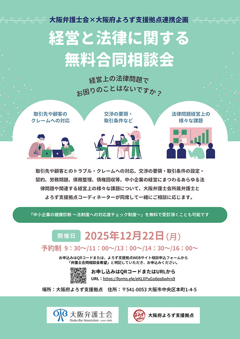 【2025年12月22日開催】経営と法律に関する無料合同相談会 大阪弁護士会×大阪府よろず支援拠点連携企画