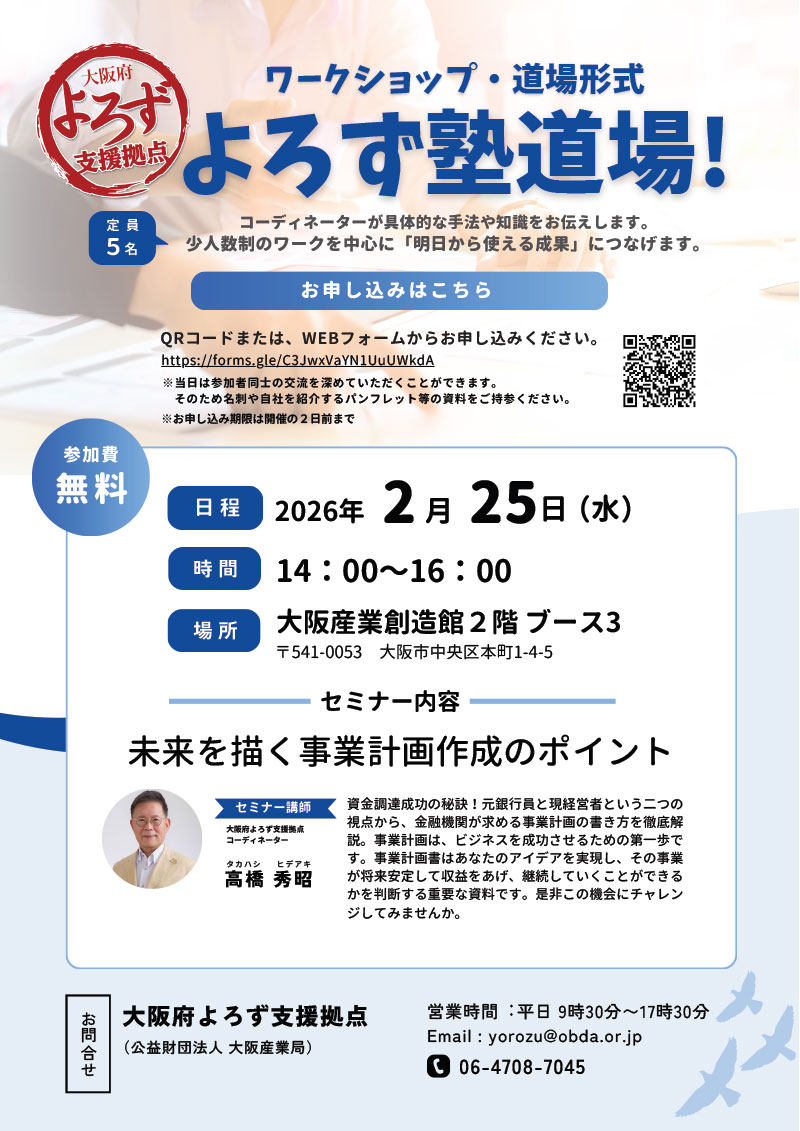 大阪府よろず支援拠点 TEL:06-4708-7045 Email:yorozu@obda.or.jp