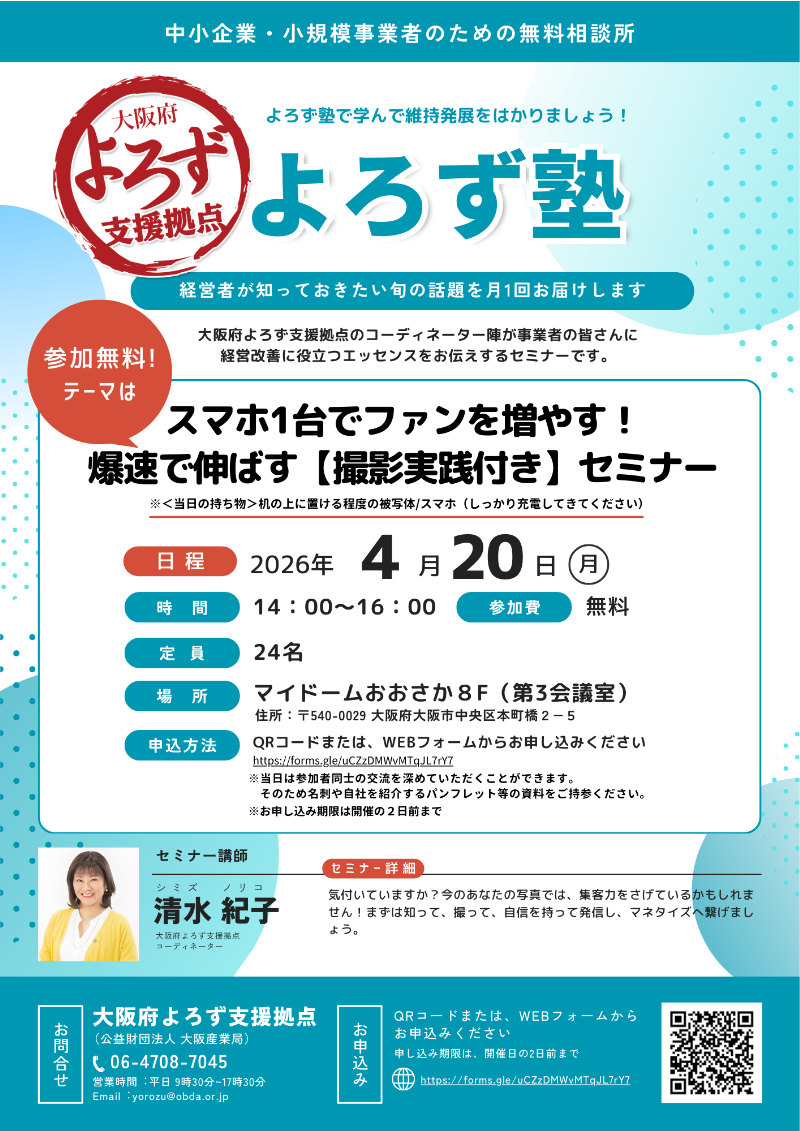 大阪府よろず支援拠点 TEL:06-4708-7045 Email:yorozu@obda.or.jp