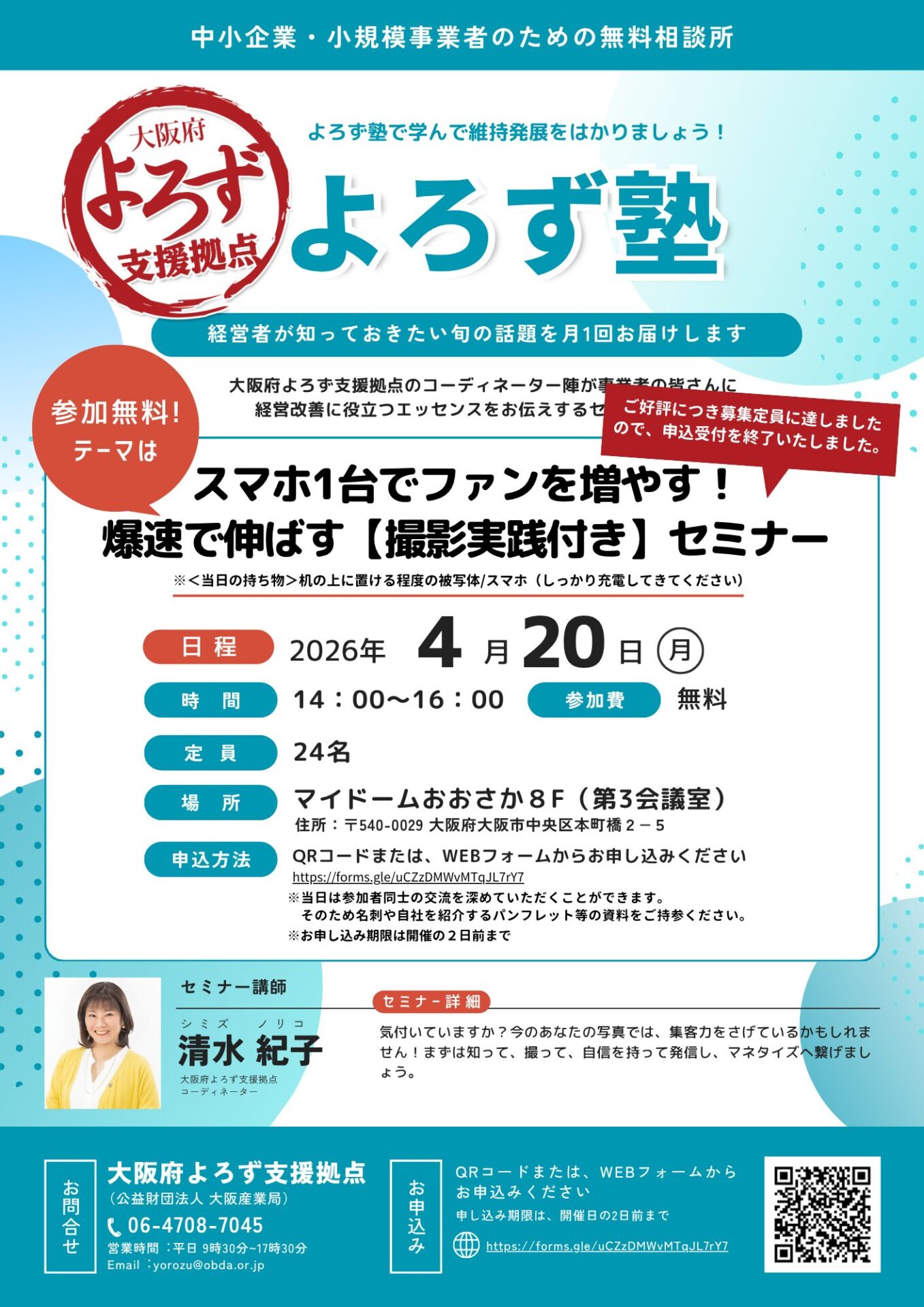 【2026年4月20日開催】スマホ1台でファンを増やす!爆速で伸ばす【撮影実践付き】セミナー
