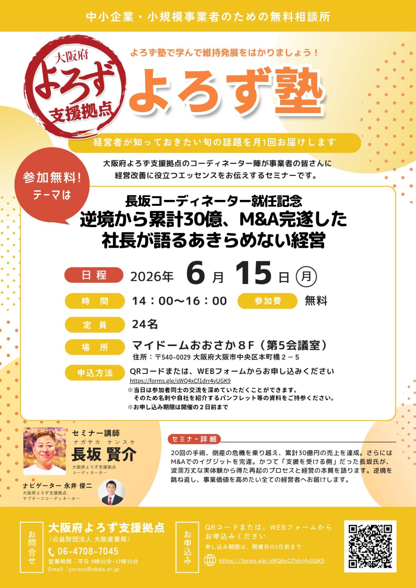 【2026年6月15日開催】長坂コーディネーター就任記念「逆境から累計30億、M&A完遂した社長が語るあきらめない経営」